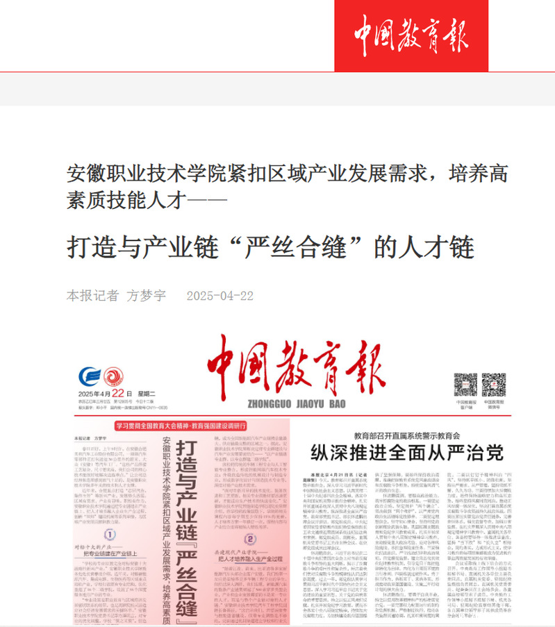 2025年4月22日,《中国教育报》第1版以《开yun登录入口登录紧扣区域产业发展需求,培养高素质技能人才——打造与产业链“严丝合缝”的人才链》为题报道我院产教融合成果。